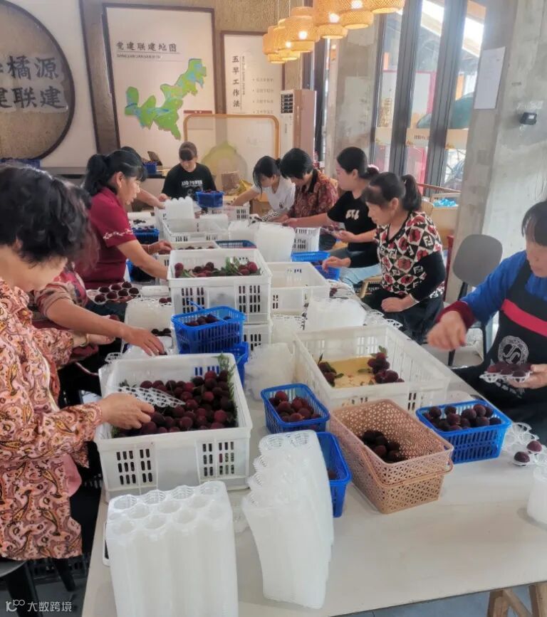 6月19日,在位于黄岩长潭湖上垟杨梅基地里,黄岩交旅集团招募的工作人员正在迅速地对刚采摘下来的杨梅进行分拣、打包。