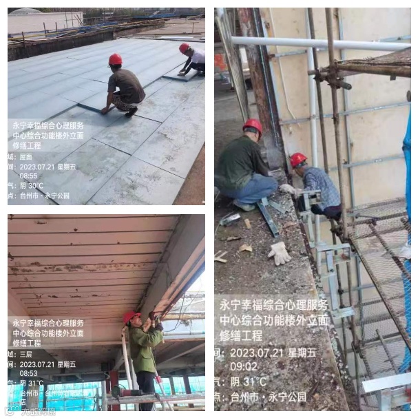 永宁幸福综合心理服务中心综合功能楼外立面修缮工程于2023年6月30日开工,目前楼面防水已完成50%、除锈油漆完成40%、幕墙龙骨安装已进场,工程预计9月底完工。