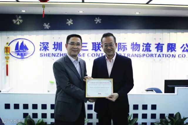 深圳市三联国际物流有限公司2016年4月13日,东方海外货柜航运有限公司(OOCL)香港分行唐健辉总经理、深圳公司赖伯东先生一行莅临三联国际物流总部参观,并颁发OOCL “最佳合作伙伴奖”,以肯定双方达成深度合作以来取得的成果。