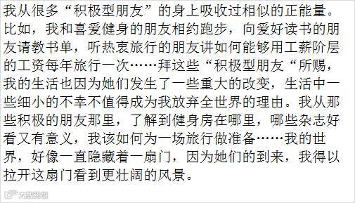 如果你真得开始了什么实际的行动,在下班后去实践那个第二类朋友所带给你的启发,那恭喜你,你成功地吸收了一个积极型朋友所带来的正能量,而如果你选择和第一个朋友把沉重的话题聊下去,我不确定你会不会成为那个“突然间受到鼓舞开始加倍努力”的那个人。