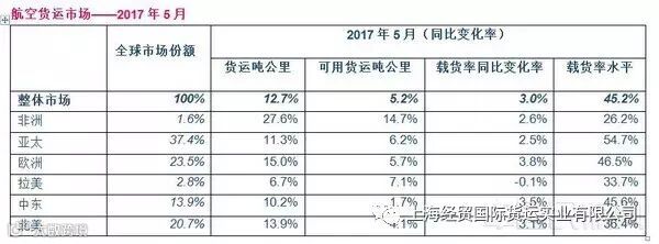 除拉丁美洲以外,各地区航空公司2017年5月份的货运需求同比均以两位数增长。