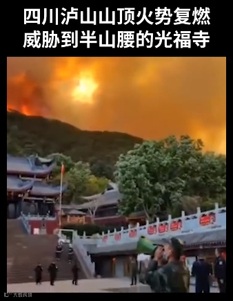 昨天17点30分左右,四川凉山州西昌市泸山山顶火势复燃,威胁到半山腰的光福寺。武警官兵立即出动,转移在山上的群众,并帮助转移寺里的贵重物资。网友:请务必注意安全!(@央视新闻、画面提供:武警四川总队)