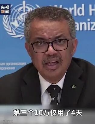 当地时间23日,世卫组织召开新冠肺炎例行发布会。世卫组织总干事谭德塞:“新冠肺炎大流行正在加速。从确诊首例到全球病例数达10万,花了67天时间;而达到第二个10万仅用了11天;第三个10万仅用了4天。可以看到病毒蔓延速度是如何加快的,这让人悲痛。” (央视)