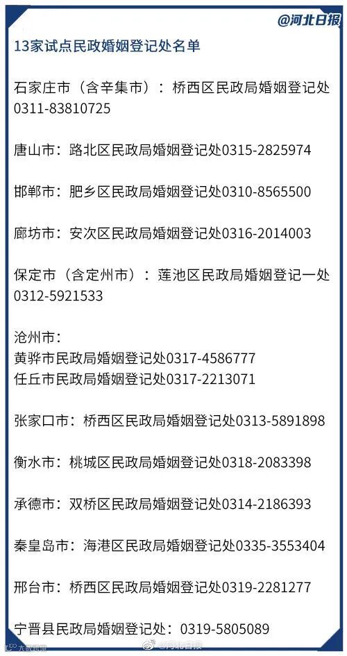 从河北省政务服务管理办公室获悉,近日,河北省政务服务办在“冀时办”APP、“冀时办”微信和支付宝小程序上推出网上预约办理婚姻登记服务。截至目前,全省共有13家民政婚姻登记处试运行网上预约登记,预计今年4月将在全省范围内实现网络预约登记结婚。除上述13家试点民政婚姻登记处外,其它婚姻登记机关原则上实行“电话预约、分时段登记办理”,办理登记业务时,当事人需在室外空气流通处等候,叫号后可进入大厅办理。