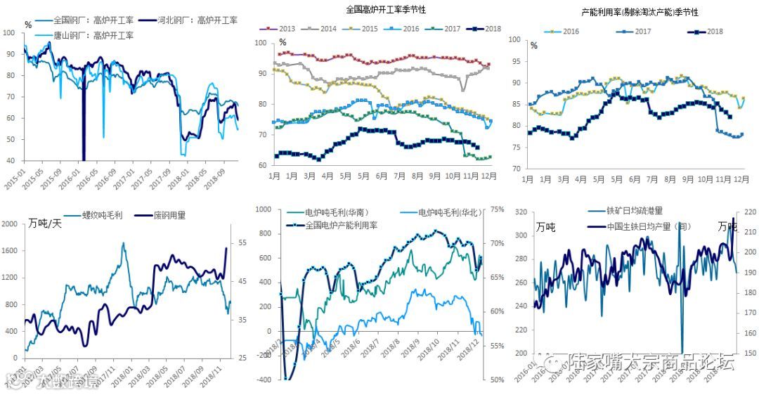 大规模减产导致供需格局大为改善。供给端是导致近一个多月钢价大幅下挫的核心因素,从11月份开始的数期报告我们一再强调大幅度亏损减产是钢价止跌的基础,在一个多月钢价下挫的过程中,钢材日产量最高下跌10万吨,这个减产力度不亚于去年采暖限产,当前供给仅比去年高了4.5%;两大核心指标成为关键:其一是亏损引起的减产规模仍在扩大,前期我们预估西北、华北、东北等低利润区域钢材特别是板材发生了明显减产,且这个趋势还在扩大;其二电炉逐渐进入盈亏平衡区域。华东等核心区域吨毛利已降至130,北材南下大量增加导致电炉主产区利润压缩,通过打压废钢短期维持利润的方式不可持续,华东、华中是电炉利润曲线的平坦区域,对钢价能形成有效支撑。
