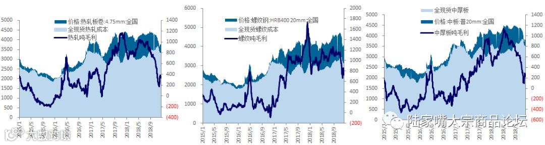 利润:本周热轧、冷轧、螺纹中厚板吨毛利分别为347元(环比-16)、120元(环比-64)、723元(环比-97)、2236元(环比-29)。近期我们对利润跟踪体系做了调整,为了直观表示及时的钢价和原料对利润的影响,忽略了原料库存对利润的滞后效应;且由于螺纹新国标执行情况尚难统一,钒成本波动较大,螺纹吨毛利暂未考虑钒的影响。