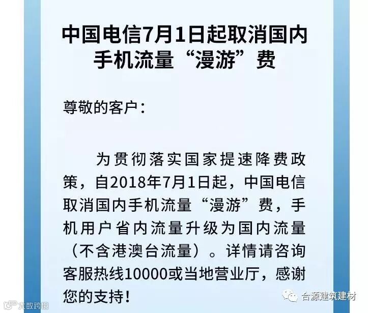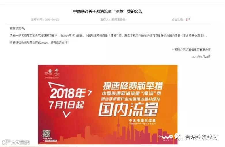 6月22日,中国联通公告称,为进一步贯彻落实国务院提速降费要求,自2018年7月1日起,中国联通取消流量“漫游”费,新老手机用户的省内通用流量升级为国内流量(不含港澳台流量)。