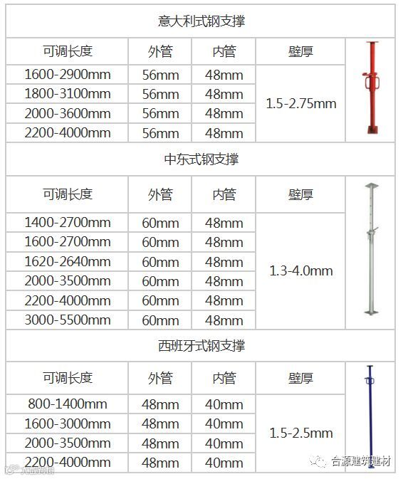 可调钢支撑钢管材质:Q235,钢管壁厚:1.5-3.5(mm),钢管外径: 48/60(中东式) 40/48(西式) 48/56(意式),调节高度:1.5m-2.8m;1.6-3m;2-3.5m;2-3.8m;2.5-4m;2.5-4.5m;3-5m等。表面处理:喷漆、喷塑、电镀锌、预镀锌、热镀锌。