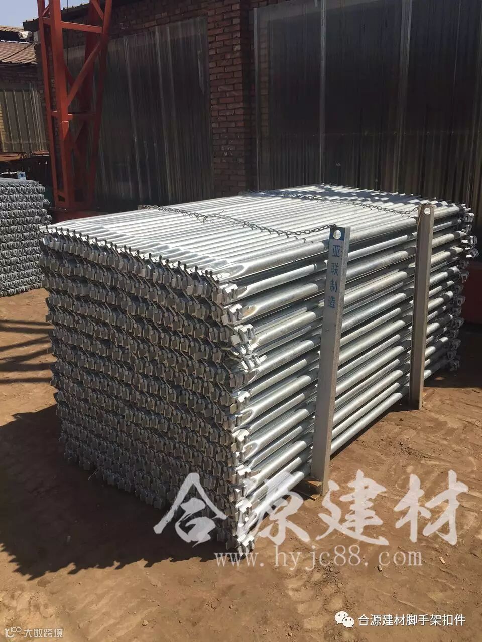 1.当一根立杆长度满足不了支撑高度,需要两根立杆对接,这时看具体需要分为两种情况:一是使用直径48mm的立杆时,可直接在立杆的一段焊上连接套管,安装时直接把两根立杆对接即可;二是当使用直径60mm的立杆时,就不能再像48管那样焊连接套管了,因为60管外再焊套管直径太大,会使立杆重量增大,安装起来非常不便。所以要使用比60管更细的连接棒,在立杆和连接棒上打孔,将连接棒插入立杆后在适合长度将两者的孔对齐,用销子插入固定,然后再用另一根立杆插入连接棒,用上面的方法同样固定,对接就算完成了。