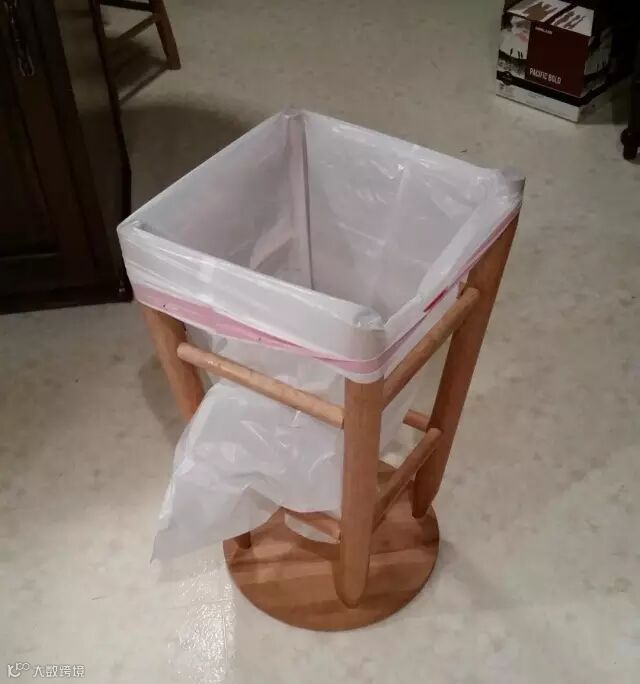 没有垃圾筒?一言不合就变一个啊!将圆凳倒置过来,套上辣鸡袋,一个活生生的垃圾筒就诞生了,容量还挺大。