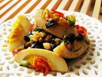2. 锅中烧热油,放入豆豉、辣椒、大蒜和葱花炒香,再加入生抽、盐调味,放入蛋快速翻炒后起锅即可。