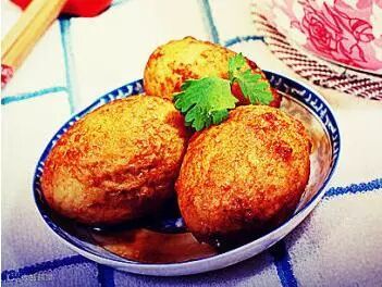 猪肉馅200克、鸡蛋6个、白洋葱1/4个、全蛋液、面粉、面包糠1杯,1杯油、1大勺生抽、1大勺老抽、1大勺米酒、1大勺白胡椒粉、盐、鸡蛋液1大勺、淀粉1小勺、香油1小勺。