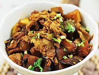 3. 起油锅下入所有材料丁炒熟,调入适量盐、料酒、胡椒粉后起锅。
