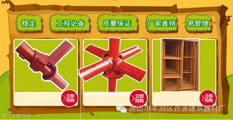 唐山市丰润区合源建筑器材厂主要从事生产销售碗扣式脚手架,轮扣式脚手架、圆盘脚手架、脚手架扣件、及其配件行业已有十多年经验。在激烈的市场竞争中,以信誉为本,以质量为生命,一如既往地竭诚为广大用户提供一流的产品和一流的服务。
