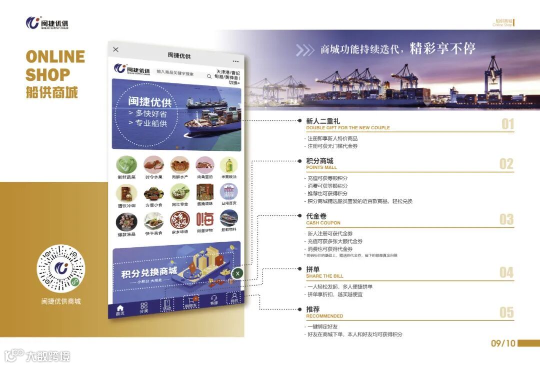 公司旗下“闽捷优供”线上商城,是一个基于移动互联网的船舶物资专业供应平台,为船东、船员提供便捷的线上一站式购物服务。商城现有蔬菜水果、米面粮油、肉禽蛋奶、海鲜水产、酒水饮料、方便速食、零食调料、日用百货、船舶物料、五金备件等10大类、3000余种商品。客户可以通过手机商城轻松挑选商品,一键下单,并在靠泊的码头收货。