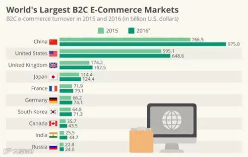 根据全球统计机构Statista二月份的报告显示,英国是全球第三大电商市场,仅次于中国和美国。报告指出,中国2015年及2016年电商销售额分别达7665亿和7950亿美元,英国2015年及2016年电商销售额分别为174.2亿美元和192.5亿美元