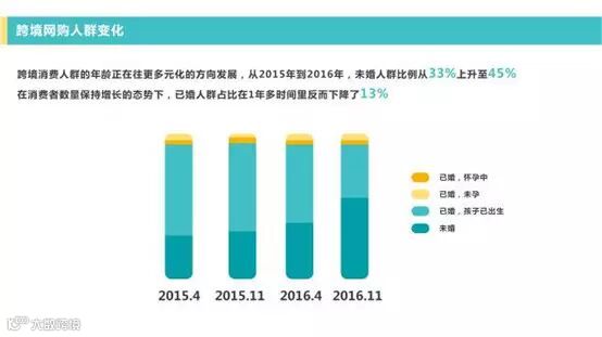 在经过一年的急速发展后,已婚群体的比例已被单身人群超越。2016年未婚的跨境消费者比例由原本的33%上升至45%,一举成为主力军,而已婚群体占比则降低了13%。
