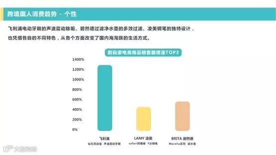 以数码家电为例,其2016年销售额增速迅速赶上并超过奢侈品居多的箱包服饰类目增速。飞利浦的电动牙刷、凌美的钢笔、碧蓝德滤水壶,凭借各自的独特功能与设计感成为2016年跨境消费者的新宠,其销售额增速均在400%以上,最高达到1200%。