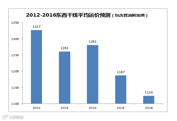 亚欧航线、南美航线都创下的历史新低,10月下旬的SCFI综合运价指数同比下滑45%,与2009年国际金融危机时的1000点相比,几乎腰斩。德鲁里报告显示,2015年东西航线加权平均运价(包括燃油附加费)将比2014年下滑7.3%,2016年将再下跌5.3%。