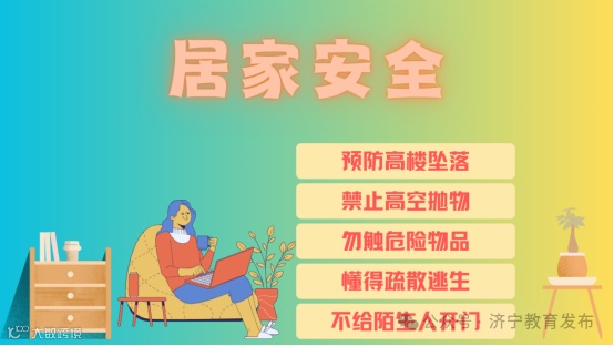 孩子居家活动时,家长应认真履行监护职责。加强消防安全教育,杜绝家庭火灾事故的发生,保证疏散通道和安全出口的畅通,教会孩子基本的应急逃生技能。预防高楼坠落,不要让孩子在窗台、阳台等危险区域玩耍。禁止高空抛物,避免造成人身伤亡和重大财物损失。关注用电安全,注意充电器、充电宝、暖手宝等小电器的质量与安全问题。防止孩子接触危险物品,关注燃气安全,预防一氧化碳中毒,谨慎做好医药的收纳工作。警惕陌生人的搭讪,家长不在时,拒绝陌生人进入家门。