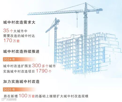 2024年,城中村改造扩围至300多个城市,实施城中村改造项目1790个。2025年,为持续用力推动房地产市场止跌回稳,住房城乡建设部将加力实施城中村和危旧房改造,推进货币化安置,计划在新增100万套城中村改造和危旧房改造的基础上继续扩大改造规模。