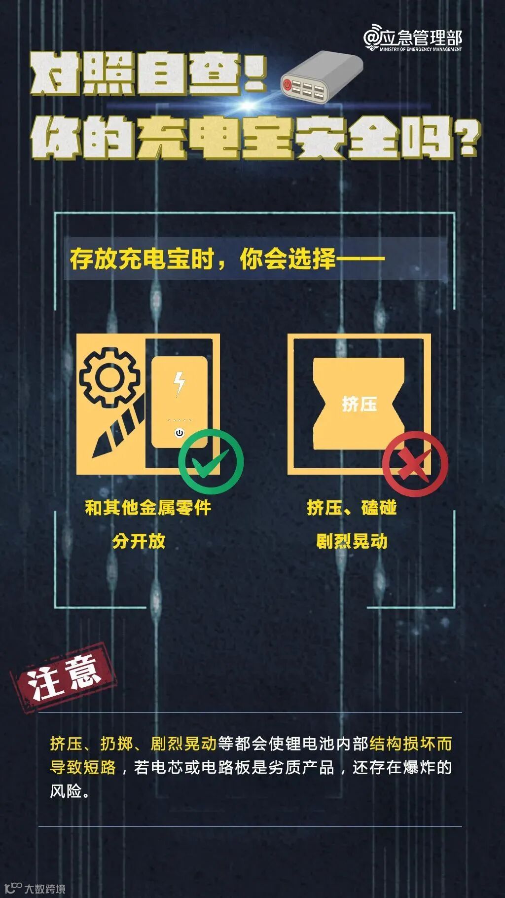 摔、碰、挤压等,可能会造成内部零件错位、电芯泄漏等,从而引发充电宝爆炸,充电宝外壳稍有鼓起时就必须停止使用。