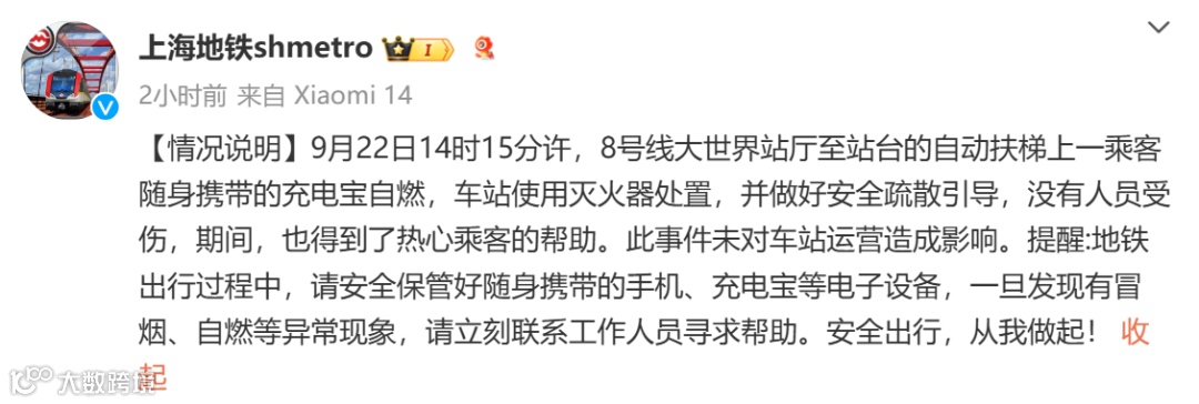 9月22日14时15分许,8号线大世界站厅至站台的自动扶梯上一乘客随身携带的充电宝自燃,车站使用灭火器处置,并做好安全疏散引导,没有人员受伤,期间,也得到了热心乘客的帮助。此事件未对车站运营造成影响。