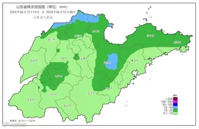 受冷涡影响,预计13日下午,鲁西北和鲁中地区有分散性强对流天气;14日早晨到夜间,全省自西向东有大范围强对流天气,鲁西北、鲁中和半岛地区有小到中雨局部大雨或暴雨,其他地区有雷雨或阵雨。对流天气过程伴有雷电、短时强降水和8~11级雷雨阵风,局部有冰雹,最大小时降水量30~50毫米。全省累积平均降水量5~15毫米(图1),雨量分布不均,其中,德州、滨州、东营、济南、泰安、潍坊、临沂北部、烟台、威海和青岛北部7~15毫米, 局部30~50毫米;其他地区3~5毫米,局部10~20毫米。
