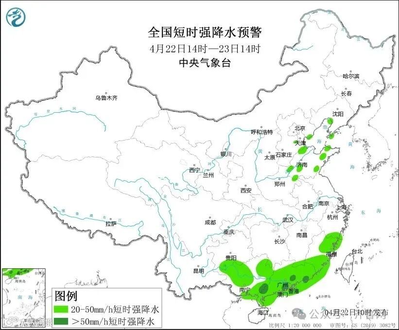 预计4月22日14时至23日14时,河北中南部、天津南部、山东中北部、河南北部、福建东部、广西东南部、广东中南部等地的部分地区将有8-10级雷暴大风或冰雹天气,局地风力可达11级;另外,山东东部和西部、江西南部、浙江南部、福建、贵州南部、广西、广东等地的部分地区将有短时强降水天气,最大小时雨量30-50毫米,局地可达70毫米以上。