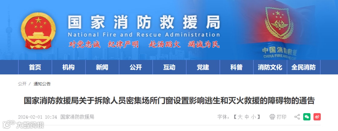 2月1日,国家消防救援局发布关于拆除人员密集场所门窗设置影响逃生和灭火救援的障碍物的通告,全文如下: