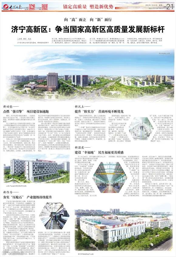 产业是区域发展的强力支撑,纵观济宁高新区的发展历程,产业始终是一条耀眼的“金线”。2023年济宁高新区新培育国家级专精特新“小巨人”企业3家,省级单项冠军、瞪羚企业、专精特新企业41家,数量居全市第一位,1—11月份汽车及零部件、医药健康行业产值分别增长64.1%、5.82%。