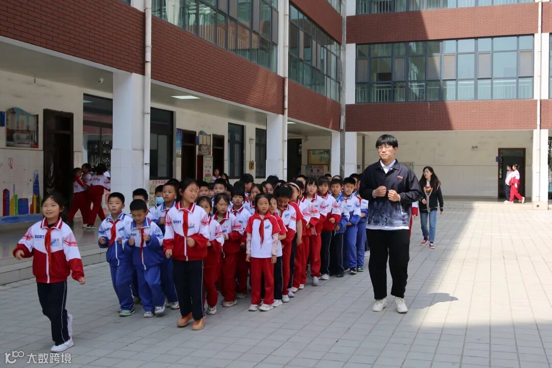 在济宁学院附属中学高新区校区小学部,实习支教老师岳耀鲁正在规整学生队伍,组织学生进行课间跑操。自今年2月初到学校开展支教工作以来,岳耀鲁对日常工作已经十分熟悉,管理起学生来得心应手。