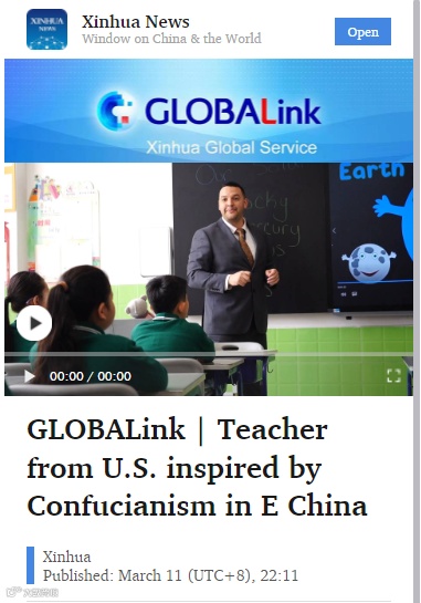 邀请新华社记者采访高新区优秀外籍教师,刊发《GLOBALink | Teacher from U.S. inspired by Confucianism in E China》,讲述来自美国的米格尔·卡纳莱斯(Miguel Canales)在中国受到儒家思想启发的故事。