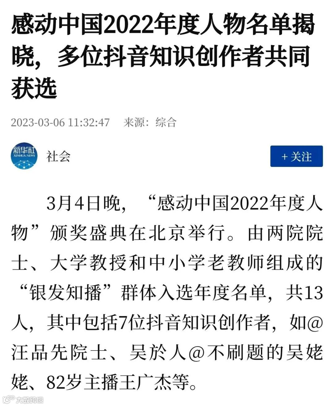 新华社等多家媒体刊发《感动中国2022年度人物名单揭晓,多位抖音知识创作者共同获选》,点赞高新区感动中国2022年度人物“银发知播”获奖者王广杰。