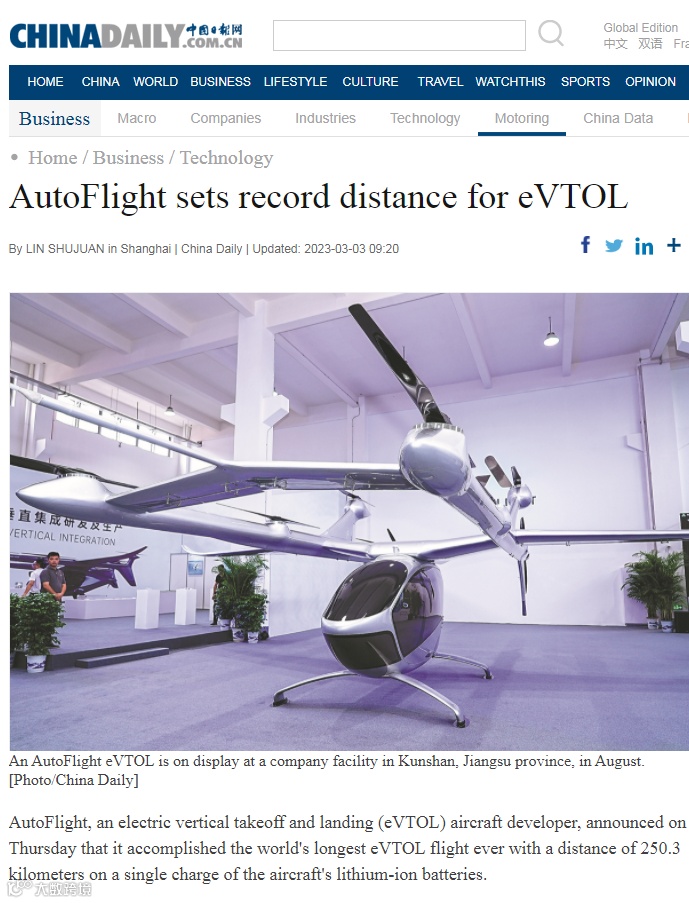 中国日报报刊及网络、客户端同步刊发《AutoFlight sets record distance for eVTOL》:济宁高新区 eVTOL飞行器在单次充电状态下顺利完成250.3公里飞行,刷新了全球2吨级eVTOL飞行器航程纪录,此次飞行测试于2月23日在峰飞山东济宁高新区测试基地完成。