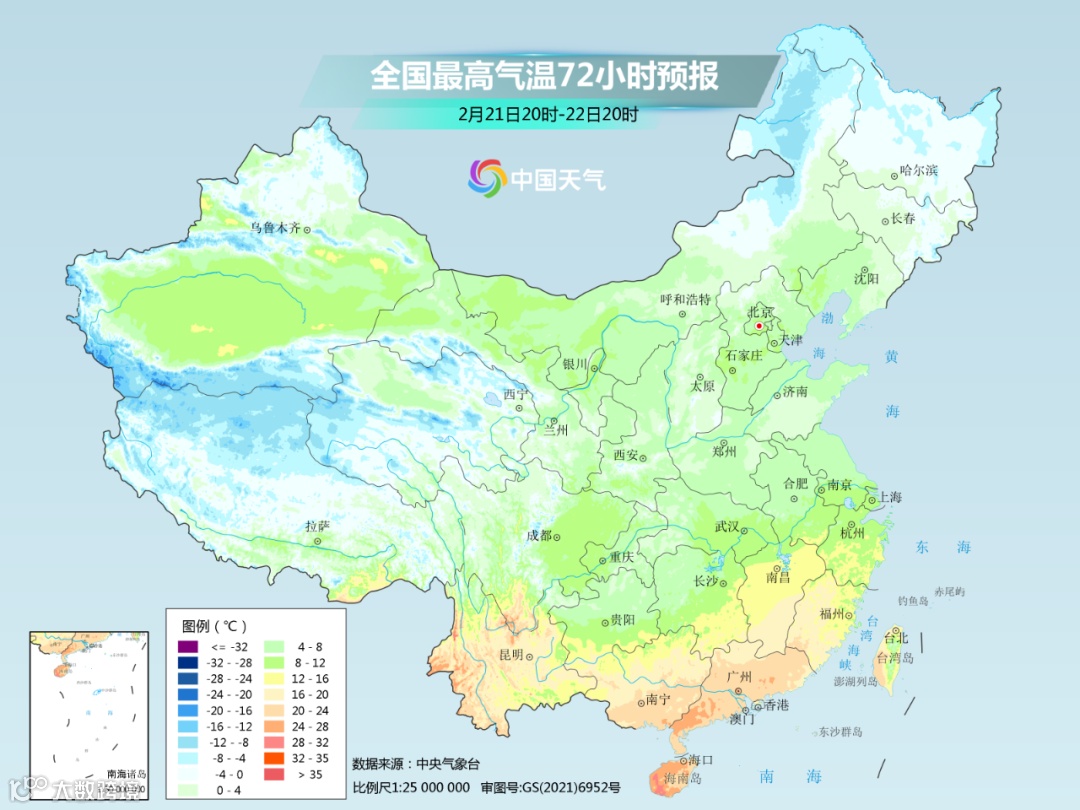 21日(周二),晴转多云,偏东风3级,最低气温2℃,最高气温7℃;