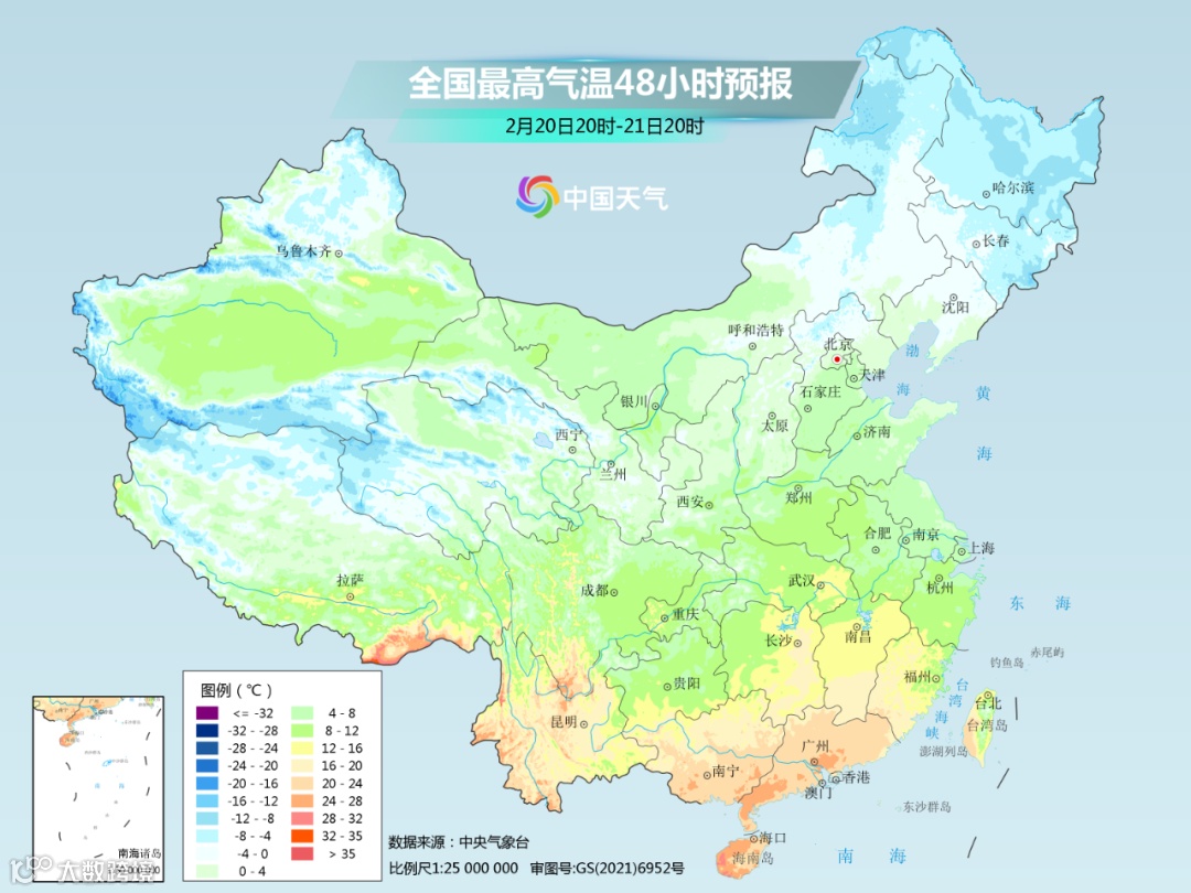 20日(周一),晴到少云,南风转东北风3~4级,最低气温1℃,最高气温13℃;