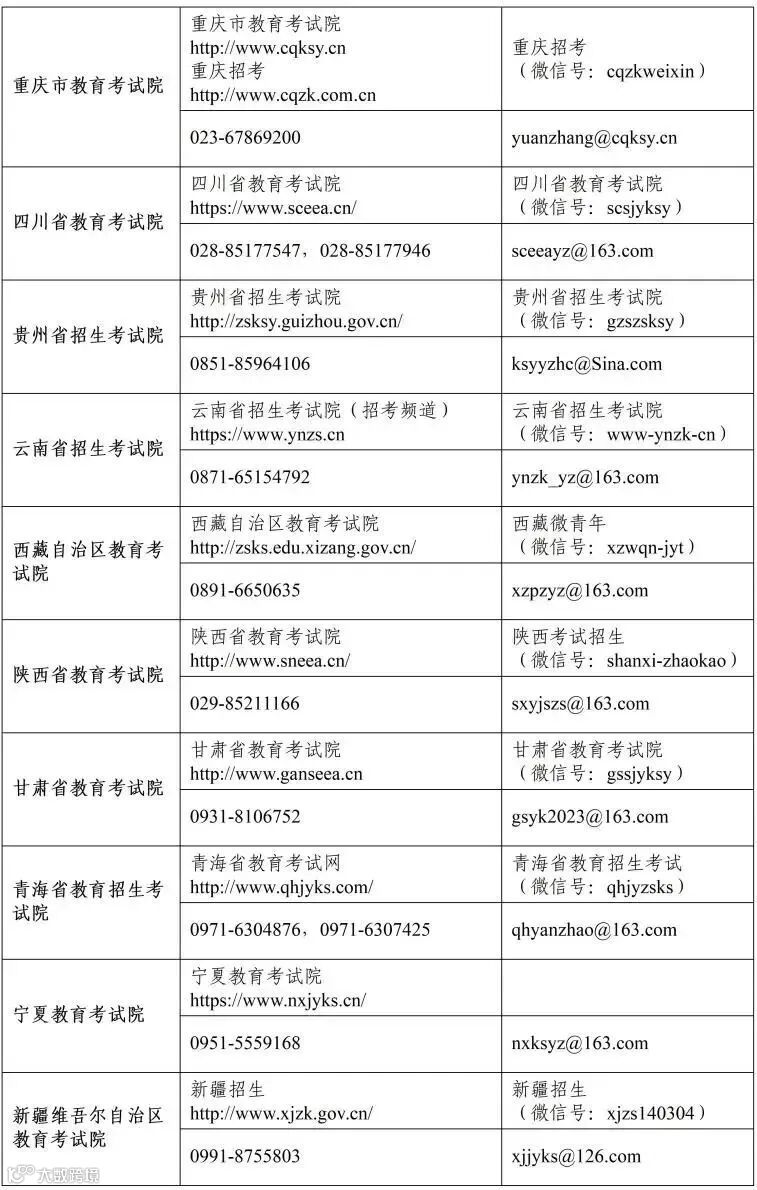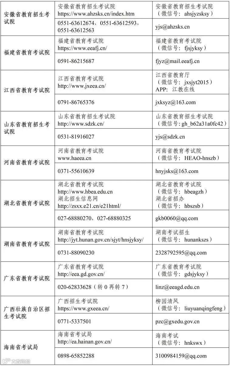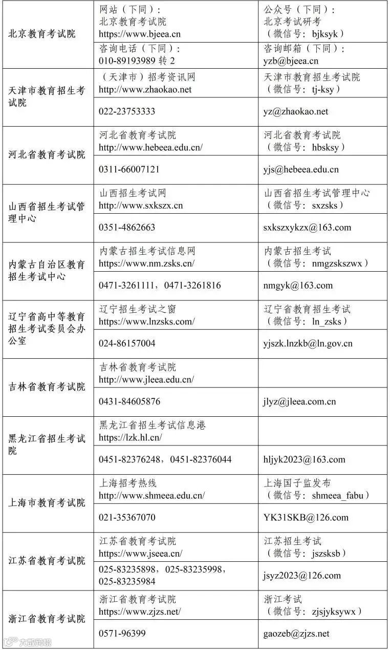 现将各省(区、市)教育招生考试机构网站、公众号和咨询方式公布如下,请考生密切关注报考点所在地省级教育招生考试机构发布的信息,做好考前准备和安排,如有疑问,可通过电话、邮箱等方式进行咨询。