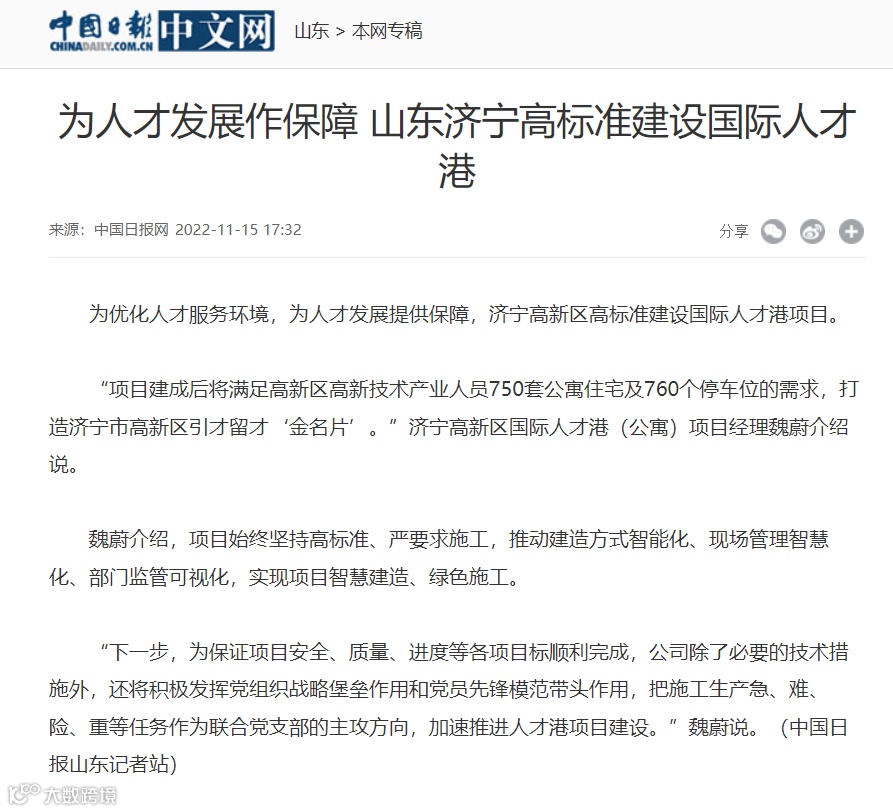 《中国日报网》2022年11月15日发文《为人才发展作保障 山东济宁高标准建设国际人才港》,文章中指出为了优化人才服务环境,为人才发展提供保障,济宁高新区始终坚持高标准、严要求建设国际人才港项目。