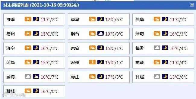鲁西北、鲁中和鲁南地区10~12℃,半岛地区8℃左右。最低气温出现在17日早上:鲁西北、鲁中和鲁西南地区0~2℃,局部0℃以下,有霜冻,其他地区4~6℃,有轻霜冻。