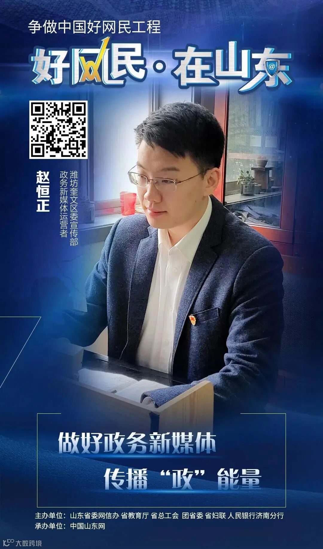 赵恒正是潍坊市政务发布号中第一个把航拍、直播、VR、图解、H5等技术应用到政务微信运营中的人,此外,他还考取了UTC航拍飞手资格证,成为了6家商业图库签约摄影师,为奎文区新媒体创建做出了突出贡献。他负责运营的奎文发布政务新媒体矩阵在2016年获得“最具影响力外宣头条号”,2019年获得“全省政务微信影响力50强”荣誉称号,全年阅读量超过3200万。