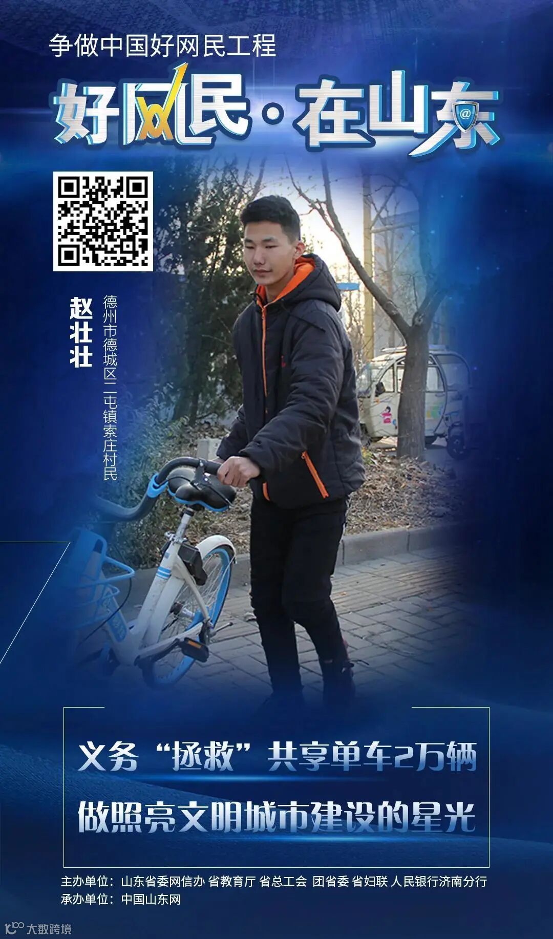 去年底,一则《00后聋哑男孩拯救共享单车2万辆》的视频引发网友关注。16岁德州男孩赵壮壮患有先天性聋哑,从事共享单车志愿者两年,每天花2小时义务整理解救乱停放和被私占的单车,两年来赵壮壮已经拯救共享单车2万余辆。当被问起最大的愿望是什么时,他这样写道:被大家需要和认可。今年1月9日,赵壮壮荣获“中国网事•感动山东2019”年度网络人物。