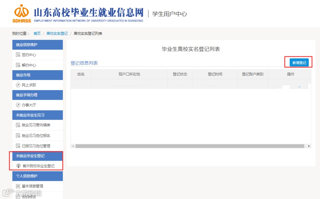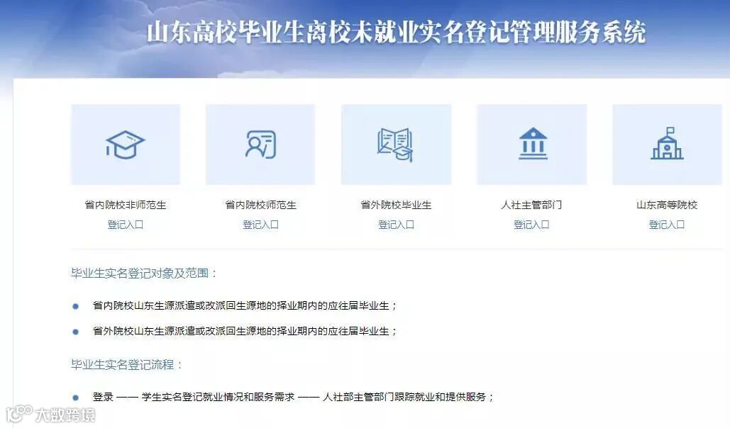 2.省外院校毕业生:首先需在“山东高校毕业生就业信息网”(http://www.sdgxbys.cn/)进行个人账号注册(注册详情查看《信息网注册审核“零跑腿”!》一文),账号审核激活后进入离校未就业实名管理服务系统,按系统提示在网上进行实名登记,填写求职意愿、服务需求等情况,完成网上报到手续。