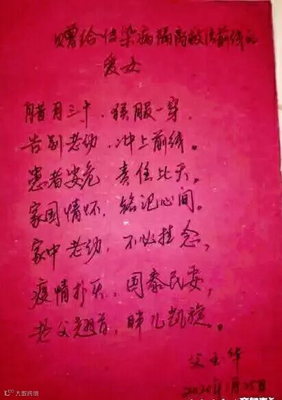 李蕊是庆云县首批进入隔离病区救治患者的医生之一。她进入隔离病区的第二天,就收到了父亲的送别诗。