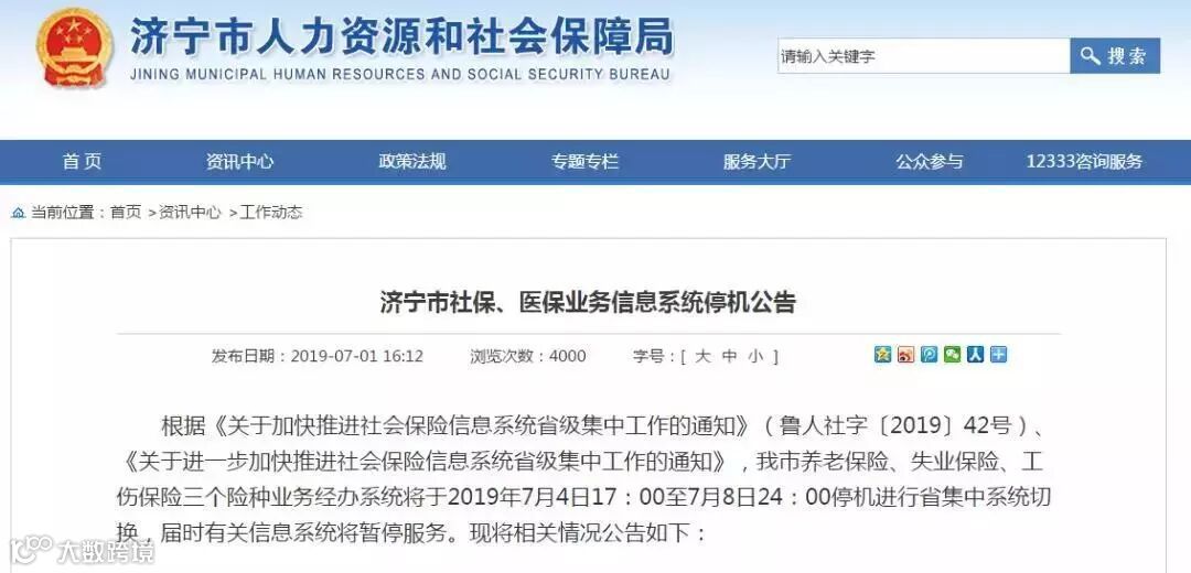 济宁市医疗保险、生育保险两个险种及社保卡业务经办系统停机时间:7月4日17:00至7月6日12:00。