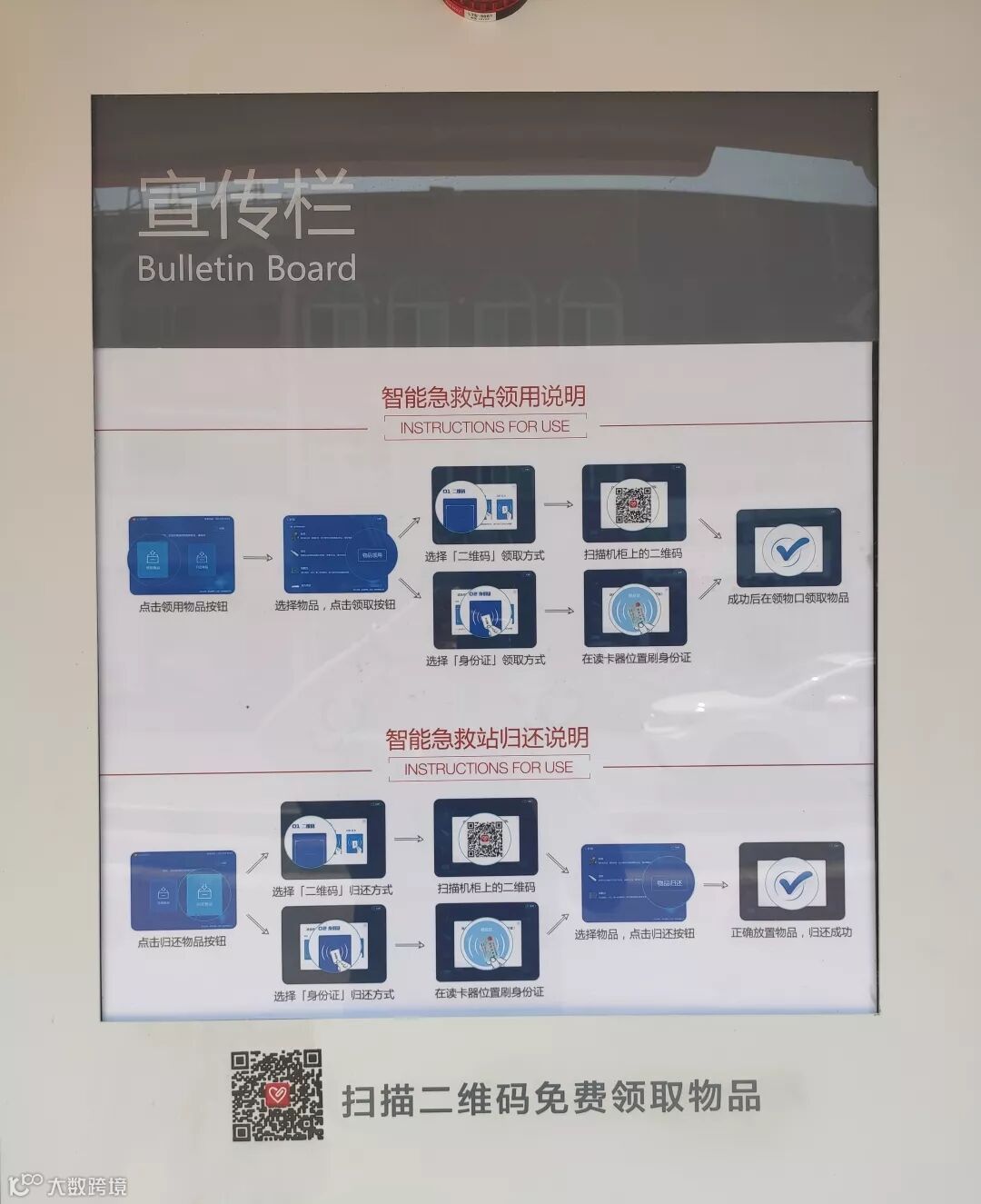 这应急小屋可谓是“麻雀虽小,五脏俱全”。小编看到,智能急救站上清楚地标明了可免费领用止血用品、包扎用品、医用冰袋、轮椅、担架、自动体外除颤仪等急救用品及医疗器械。