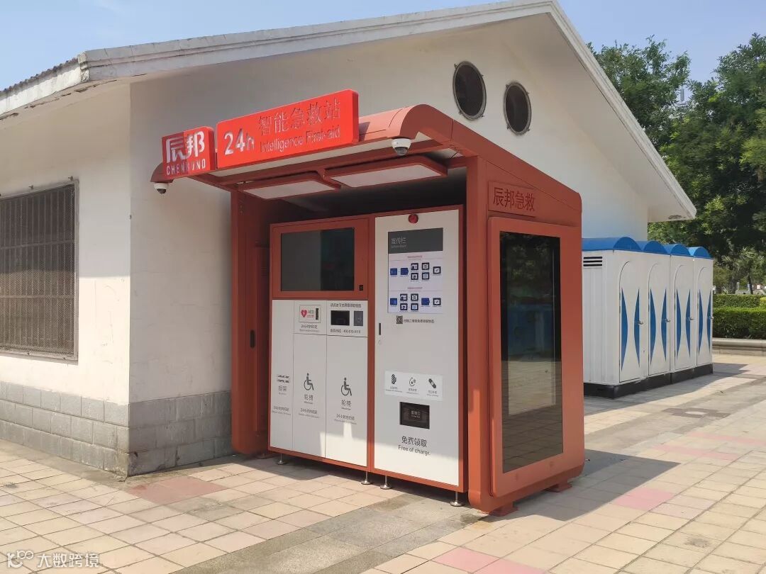 果然,急救小屋就在附近!远远望去,一抹鲜艳的红色在新世纪广场东南侧,卫生间以北,十分抢眼。智能急救站外形颇似一个报刊亭,占地约五六平方米,外形十分规整,几块大屏幕彰显着“智能”的身份。