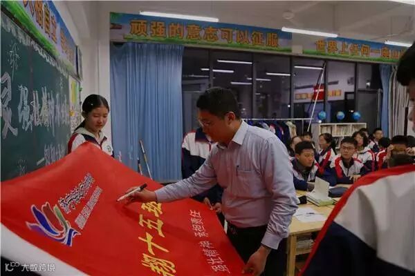 远足拉练前夕,高一年级在学校演艺大厅进行集体发动,并与各班签订责任书。高一、初一各班分别召开主题班会,全体师生都在班旗上郑重签上自己的名字。