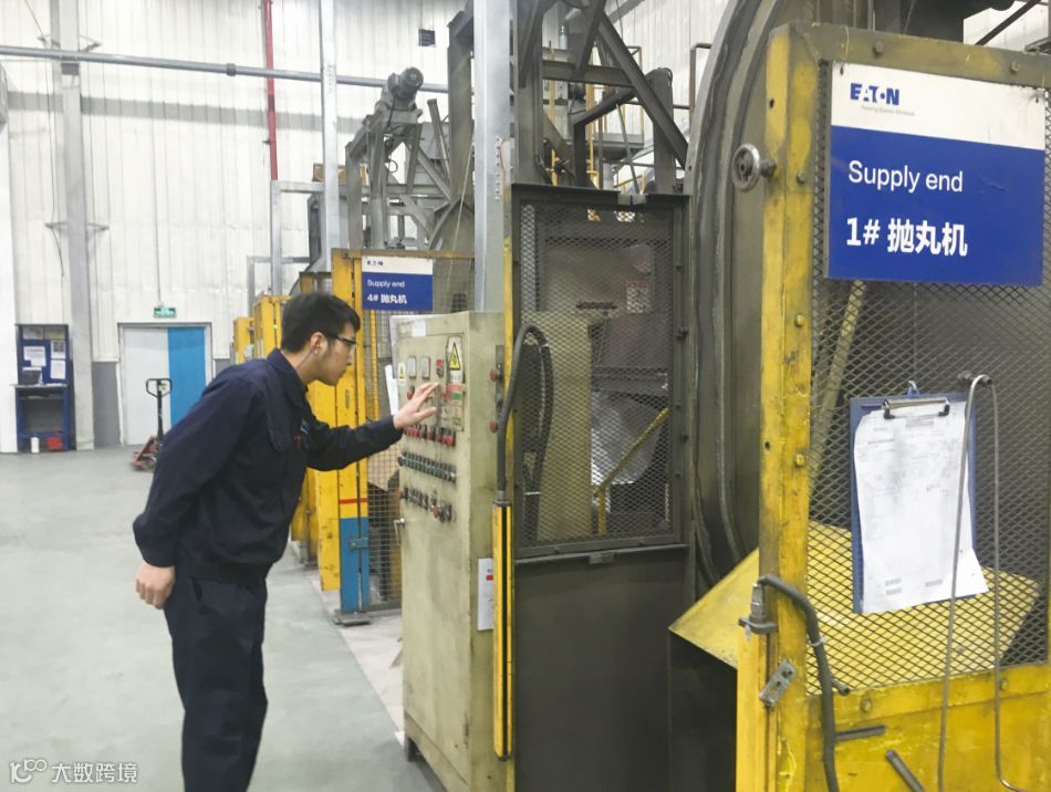 在伊顿工业园东北角,四期项目厂房内,4台抛丸机正在作业。工作人员按下控制柜上的“自动启动”按钮,工件运行至抛丸位处,大门自动关闭,抛丸机进入自动抛丸处理中。自从10月26日抛丸机正式开始运转以来,每24小时就可完成15万支工件的抛丸清理。