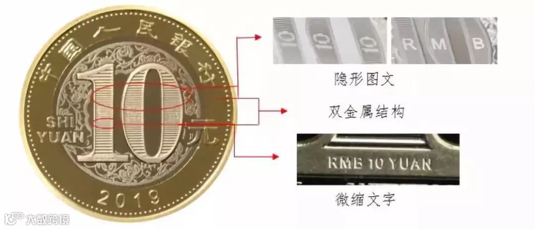 在硬币正面面额数字“10”的底端,可观察到“RMB 10 YUAN”的微缩文字。